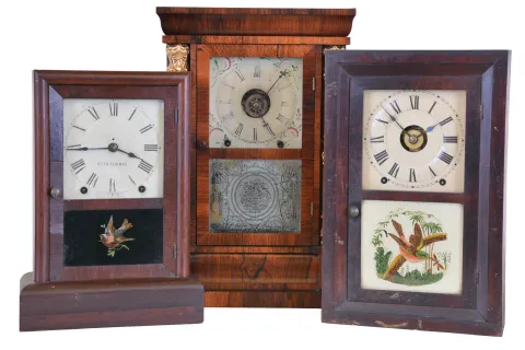 Clocks- 3 (Three): (1) Chauncey Jerome, New Haven, Conn. empire shelf clock with a spring driven 8 day time, strike and alarm movement in a rosewood veneered case with decorative gilt half columns, c1850. (2) Seth Thomas Clock Co., Thomaston, Conn., Cottage shelf clock with a spring driven 8 day time and strike movement in a rosewood veneered case, c1900. (3) Seth Thomas Clock Co., Thomaston, Conn. "Kitchen" shelf clock with a spring driven 8 day time, strike and alarm movement in a rosewood case, c1890. (1) The case has been nicely refinished and the half columns have been regilded There are some veneer repairs to the base. The painted dial has faded with some loss. The hands appear original. The door glasses are both original. Ht. 18.25in. (2) The case retains its original finish with some veneer repairs on the door and minor veneer damage on the right base return. The original painted dial is in good condition. The hands appear original. The upper door glass is original. The lower door glass is original, but has black painting added on the reverse side. Ht. 14.5in. (3) The case has its original finish. The dial has repainted and the hands replaced. Both door glasses appear original. Ht.15.75in.