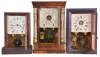 Clocks- 3 (Three): (1) Chauncey Jerome, New Haven, Conn. empire shelf clock with a spring driven 8 day time, strike and alarm movement in a rosewood veneered case with decorative gilt half columns, c1850. (2) Seth Thomas Clock Co., Thomaston, Conn.,