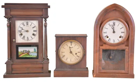 (1) Mahogany veneered case in old finish. Dial is now a piece of card stock. Period hands are mismatched. Original tablet. Ht 15" (2) Mahogany veneered case in an old finish has some loss on the base and a repair on the top front. Dial has been repainted. Tablet is missing. Hands are not original. Partial label inside the case. Ht 19" (3) Rosewood veneered case has remains of an old finish. Left side base piece is missing and a piece of ripple molding is missing on the right side. An extra piece of molding is included, but does not match. Original painted dial is soiled with some loss at the mounting screws. Original hands. Movement is signed. Ht 10.75" (4) Mahogany veneered case in an old finish in nice condition. Paper dial signed "New Haven" is not original. Modern hands. Nice tablet is not original. Ht 19" (5) Rosewood veneered case has a couple chips on the base. Dial has been repainted. Nice hands are not original. Original tablet has some loss. Ht 11.25"