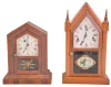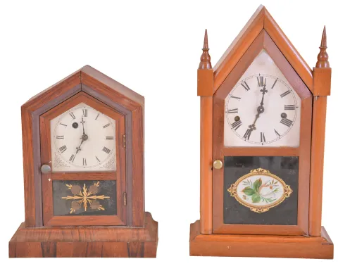 Clocks- 5 (Five): (1) Waterbury Clock Co., Waterbury, Conn., 30 hour, time and strike spring brass movement sharp gothic or steeple clock, c1875 (2) Chauncey Boardmand, Bristol, Conn., 30 hour, time and strike spring brass fusee- spring movement round