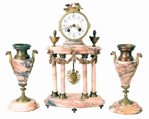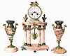 France, mantel clock with garniture, pink variegated portico style clock with gilt ornament, Arabic numeral white enamel dial, gilt Louis XV style hands, Helios mask pendulum, 8 day time and strike pendule de Paris movement, with matching, vase form side