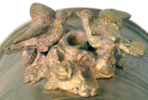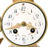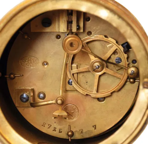 clock case with minor chip, one column repaired, losses to gilding, dial with hairlines and minor chips above 12:00, case back with replaced insert, one vase with bent mouth and minor verdigris, ticks and strikes, clock case dimensions listed
