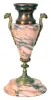 France, mantel clock with garniture, pink variegated portico style clock with gilt ornament, Arabic numeral white enamel dial, gilt Louis XV style hands, Helios mask pendulum, 8 day time and strike pendule de Paris movement, with matching, vase form side pieces clock case with minor chip, one column repaired, losses to gilding, dial with hairlines and minor chips above 12:00, case back with replaced insert, one vase with bent mouth and minor verdigris, ticks and strikes, clock case dimensions listed