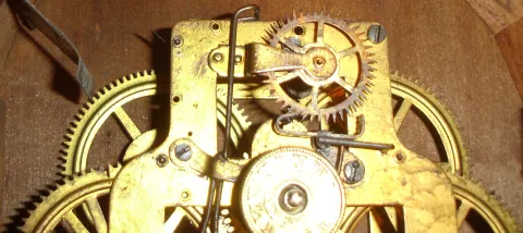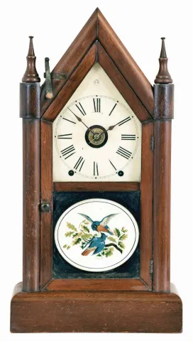 Seth Thomas Clock Co., Thomaston, Conn., "Sharp Gothic" shelf clock with an 8 day spring driven time, strike and alarm movement in a mahogany case. The movement is modified for the Winward Patent (British) Railway Alarm mechanism.