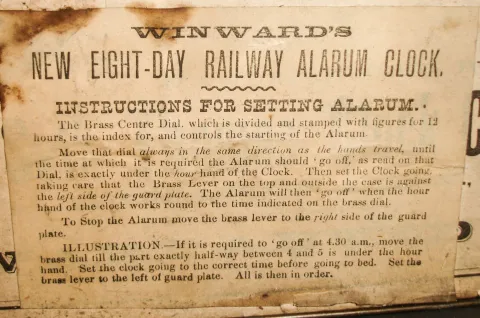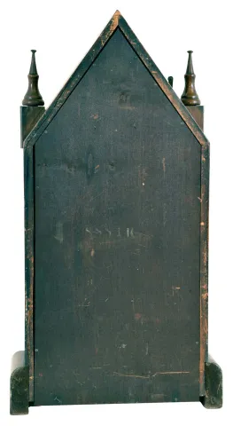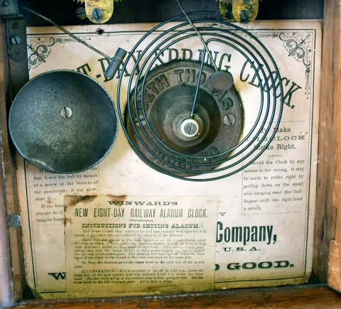 Seth Thomas Clock Co., Thomaston, Conn., "Sharp Gothic" shelf clock with an 8 day spring driven time, strike and alarm movement in a mahogany case. The movement is modified for the Winward Patent (British) Railway Alarm mechanism. The case is in very good condition and retains its original finish. The original painted dial is in good condition with no loss. The hands are original. The movement is signed. The door glasses are original. The Seth Thomas label inside the case has a nice "Winward's Patent Alarm" overpasted label with instructions for the alarm