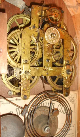 The case is in very good condition and retains its original finish. The original painted dial is in good condition with no loss. The hands are original. The movement is signed. The door glasses are original. The Seth Thomas label inside the case has a nice "Winward's Patent Alarm" overpasted label with instructions for the alarm