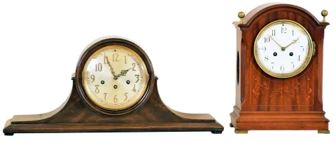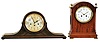 (1) Refinished mahogany and mahogany veneered case has a small knick on the top front. Original silvered dial with raised numbers is pretty clean with a couple small stains. Original hands and pendulum. Movement is signed. Ht 10" (2) Refinished mahogany and inlayed case has a knick on the upper right corner and a ding on the base. Original porcelain dial has minor damage at the fast / slow setting arbor. Original hands and pendulum. Ht 13.5"