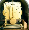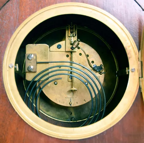 Clocks- 2 (Two): (1) Seth Thomas Clock Co., Thomaston, Conn., "Chime Clock No. 75", 8 day, time, strike and Westminster chime on rods spring brass movement Tambour mantel clock, c1921 (2) French, for Harris & Harrington (H&H), 8 day, time and strike
