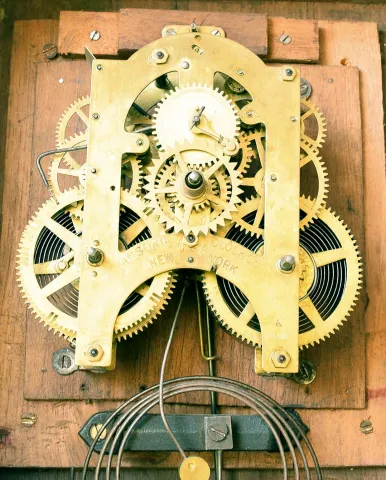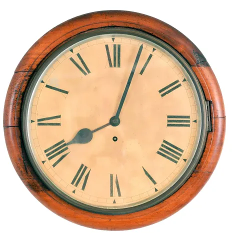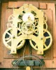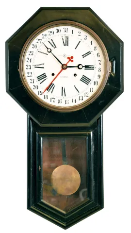 Clocks- 3 (Three) 8 day wood case wall clocks: Sessions "Regulator E" oak time only store regulator; Ansonia black painted "Regulator A" time and strike; English dial unsigned time only fusee; all early 20th century the Ansonia walnut case has been painted black, its painted metal dial shows some fading, and its top glass needs to be secured. The Sessions case has a newer glossier finish, and there is a small ding at the top; the top glass and paper dial are worn. The fusee's bezel has some age splits, its bottom door is absent, its painted dial has some stains and small losses. All are sold as is with no further details available. Ansonia ht 32 in, Sessions 38.5 in, fusee overall diameter is 15 in