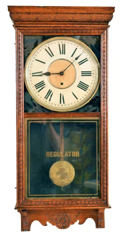 Clocks- 3 (Three) 8 day wood case wall clocks: Sessions "Regulator E" oak time only store regulator; Ansonia black painted "Regulator A" time and strike; English dial unsigned time only fusee; all early 20th century