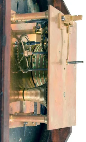 the Ansonia walnut case has been painted black, its painted metal dial shows some fading, and its top glass needs to be secured. The Sessions case has a newer glossier finish, and there is a small ding at the top; the top glass and paper dial are worn. The fusee's bezel has some age splits, its bottom door is absent, its painted dial has some stains and small losses. All are sold as is with no further details available. Ansonia ht 32 in, Sessions 38.5 in, fusee overall diameter is 15 in