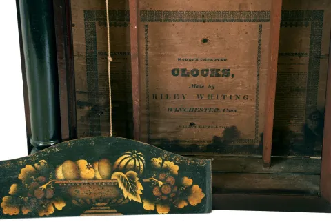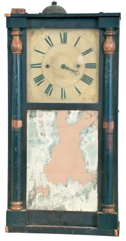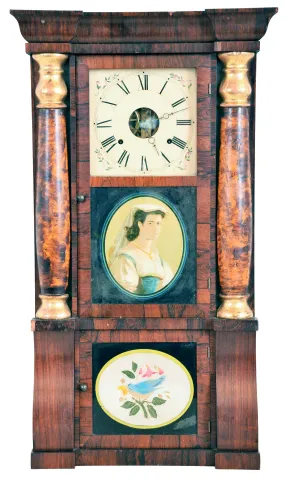 Clocks- 3 (Three): (1) Jonathan Burr, Lexington, Mass., "Half Column and Splat" shelf clock with a 30 hour time and strike wooden works movement ("groaner") in a mahogany case, c1835. (2) Seth Thomas Clock Co., Thomaston, Conn., "Cornice and Column" shelf clock with an 8 day weight driven time and strike brass lyre movement in a rosewood case with tortoise shell columns with gilt caps and bases, c1870; (3) Riley Whiting, Winchester, Conn., "Half Column and Splat" shelf clock with a 30 hour time and strike wooden works movement in a mahogany case, c1835. (1) The splat, chimneys and returns are missing. The finish is dark. The door glasses are original but the mirror has deteriorated. The painted dial has darkened and the movement has only the hour hand. No weights or pendulum bob. Ht. 31.25in. (2) The case retains some original finish but has veneer chips in multiple locations. The dial has been repainted. The hands are original. The movement is signed. The door glasses are period. No weights. Ht. 32.25in. (3) The case has been refinished. The painted dial is showing wear. The hands are original. Both door glasses are original. The splat is a replacement. No pendulum bob. Ht. 33in.