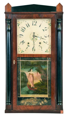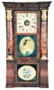Clocks- 3 (Three): (1) Jonathan Burr, Lexington, Mass., "Half Column and Splat" shelf clock with a 30 hour time and strike wooden works movement ("groaner") in a mahogany case, c1835. (2) Seth Thomas Clock Co., Thomaston, Conn., "Cornice and Column" shelf