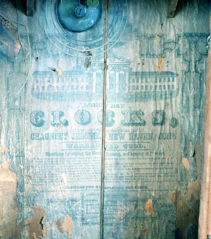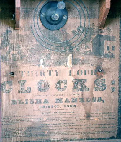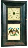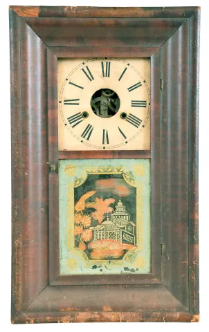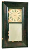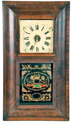 Clocks- 5 (Five) (1) Charles Stratton, Worcester, Mass. OG shelf clock with a 30 hour weight driven time and strike wooden works movement. label dated1841. (2) Elisha Manross, Bristol, Conn., OOG shelf clock with a 30 hour spring driven time and strike brass movement, c1850. (3) Chauncey Jerome, New Haven, Conn., OOG shelf clock with an 8 day weight driven time and strike brass movement, c1850. (4) Chauncey Jerome, New Haven, Conn., OG shelf clock with an 8 day weight driven time and strike brass movement, c1850. (5) Clarke, Gilbert & Co., Winchester, Conn. OG shelf clock with a 30 hour weight driven time, strike and internal alarm brass movement, c1845. (1) Veneer damage; no hands or weights. The case door has an old mirror and old upper glass; Ht. 26.5in. (2) Veneer damage; no weights, Upper door glass missing. Lower glass has a William B. Fenn tablet; Ht 26in. (3) Veneer damage; dial repainted; no weights; Ht. 30in. (4) Minor veneer damage; no weights; Ht. 30in; (5) Minimal veneer damage; Very good original hands and dial; no weights; door has original glasses; Ht. 26in.