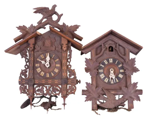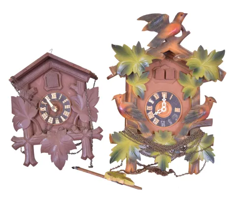 Clocks- 7 (Seven) German Cuckoo two- weight thirty- hour, 5 are larger older examples, 2 are modern