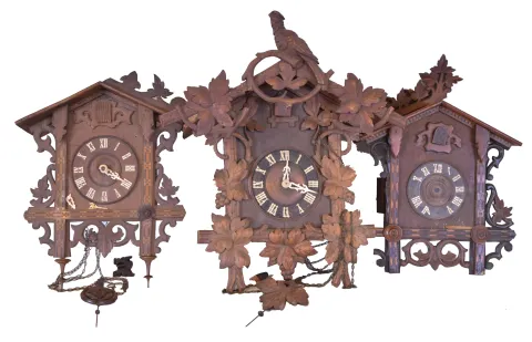 Clocks- 7 (Seven) German Cuckoo two- weight thirty- hour, 5 are larger older examples, 2 are modern three boxes: these are mostly complete and of better quality, but they all need repairs and restorations, or can be useful for parts. Sold as is, no further details available