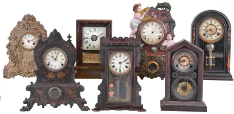 Clocks- 7 (Seven): (1) Reproduction Nicholas Muller "Baseball Players" iron front shelf clock with a period spring driven 30 hour time and strike movement. (2) Seth Thomas Clock Co., Thomaston, Conn., "Cottage shelf clock with a spring driven 8 day time, strike and alarm movement in a veneered case, c1900. (3) Muller iron front clock (with no movement and with a new case). (4) Unmarked Round Top shelf clock with a spring driven 8 day time and strike movement in a rosewood veneered case, c1890. (5) Daniel Pratt, Boston, Mass, shelf clock with a spring driven 8 day time and strike movement in a rosewood veneered case, c1880, (6) New Haven Clock Co., New Haven, Conn., "No. 511" shelf clock with a spring driven 8 day time and strike movement in a darkly finished wood case, c1886. (7) Unmarked Iron Front shelf clock with a spring driven 8 day time and strike movement, c1860. (1) The reproduction iron front is cast from aluminum. The movement is period, as are the dial, hands and bezel. Ht. 16in. (2) The case finish is quite rough. The painted dial has losses at several areas. The hands are original. Ht. 14.5in. (3) Although the iron front is not marked as Muller, it is period and very closely resembles the "Globe" iron front shown on page 103 in Arlyn Rath's book on Nicholas Muller. Part of the top of the iron front is missing. Ht.19in. (4) The original finish is very dark. The dial has darkened with age. The movement is not signed. The hands are period. Ht, 17in. (5) The finish has darkened with age. The paper dial has darkened with age. The hands are original. Ht. 16.5in. (6) The original finish has darkened to the point that it is difficult to determine what type of wood veneer was used. The right base return is missing. The paper dial is replaced. The hands are period. Ht.18.5in. (7) There is loss of paint on the iron front. The paper dial is original and darkened with age. The hands are period. Ht. 18.5in.