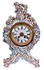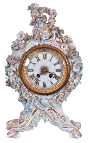 Meissen, Germany, an ornate porcelain mantel clock, the case in pastel colors with gilt accents, with rococo styling and festooned with floral ornament, Roman numeral enamel dial, gilt hands, 8 day time and strike round, French style movement