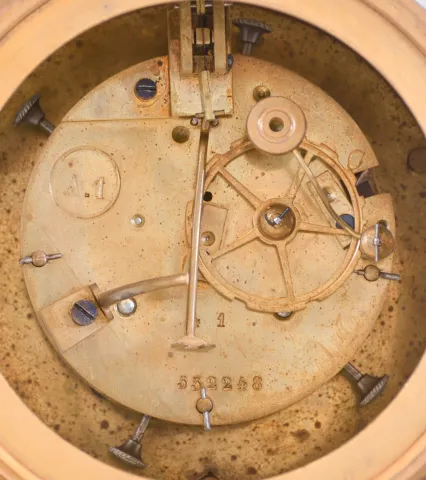 case dirty, and with minor losses, dial and hands good, ticks and strikes, bell stand broken, case bottom with crossed swords mark