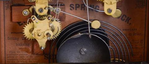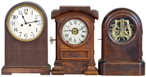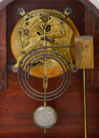 Clocks- 3 (Three): (1) Seth Thomas Clock Co., Thomaston, Conn., "Tudor No. 1" shelf clock with an 8 day spring driven time and strike lyre movement in a rosewood case, c1870 (2) Seth Thomas Clock Co., Thomaston, Conn., "Arch Top" model shelf clock with an 8 day spring driven time, strike and alarm movement in a walnut case, c1875. (3) Waterbury Clock Co., Waterbury, Conn., "Birmingham" model shelf clock with as 8 day spring driven time and half hour strike movement in a mahogany case, c1920. (1) The case is in good condition with original finish. The dial is missing. The hands appear to be period. The movement is signed. Ht. 15in. (2) The case has veneer issues in several locations. The finish is period and perhaps original. The original painted dial is in good condition. The hands appear to be original. Of note is the very unusual American Clock Co. (581 Broadway, NY) label on the back side of the case. Ht. 15.5in. (3) The case has its original finish. The porcelain dial is in excellent condition with no loss, The hands are original. Ht. 16.3in.