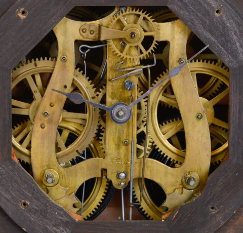 Clocks- 3 (Three): (1) Seth Thomas Clock Co., Thomaston, Conn., "Tudor No. 1" shelf clock with an 8 day spring driven time and strike lyre movement in a rosewood case, c1870 (2) Seth Thomas Clock Co., Thomaston, Conn., "Arch Top" model shelf clock with an