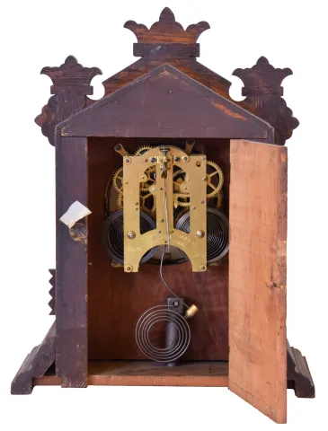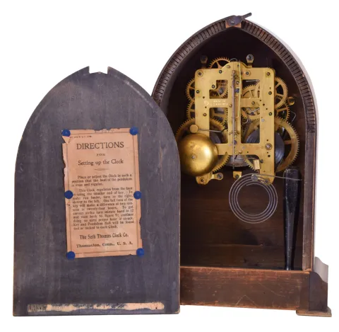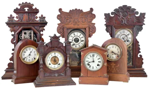 Clocks- 7 (Seven): (1) Waterbury Clock Co., Waterbury, Conn., 8 day, time, strike and alarm spring brass movement shelf clock, c1900 (2) New Haven Clock Co., New Haven, Conn., 8 day, time and strike spring brass movement shelf clock, c1890 (3) E. Ingraham & Co., Bristol, Conn., 8 day, time and strike spring brass movement shelf clock, c1890 (4) Ansonia Clock Co., New York, NY 8 day, time and strike spring brass movement cabinet series shelf clock, c1890 (5) Seth Thomas Clock Co., Thomaston, Conn., 8 day, time and strike spring brass movement round top mantel clock, c. 1910. (6) New Haven Clock Co., New Haven, Conn., 8 day, time and strike spring brass movement mantel clock, c1905 (7) Seth Thomas Clock Co., Thomaston, Conn., 8 day, time and strike spring brass movement beehive mantel clock, c1910 (1) Oak case has lost most of its original finish. Paper dial has been replaced. Both ears on the top crest have been repaired. Original pendulum. Tablet is broken. Hands are not original. Ht 22" (2) Walnut case in original finish. Original painted dial has lost most of its paint. Hour hand is a replacement. Original pendulum and tablet. Ht 23" (3) Walnut case in original finish. Dial, pendulum and tablet are missing. A new dial pan is included. Original hands. Alarm movement is missing. Ht 24" (4) Oak case in original finish. Original porcelain dial has a hairline crack between 8 and 9 o'clock. Original hands. Ht 15" (5) Refinished mahogany and mahogany veneered case. Original Ivorine dial has age darkened a little. Original hands. Ht 13" (6) Walnut case in original finish has a shrinkage crack just below 7 o'clock. Original painted dial in nice condition. Original hands. Pendulum bob is missing. (7) Mahogany veneered case in original finish Original ivorine dial has age darkened a little. Original hands. Ht 13"
