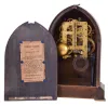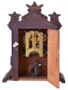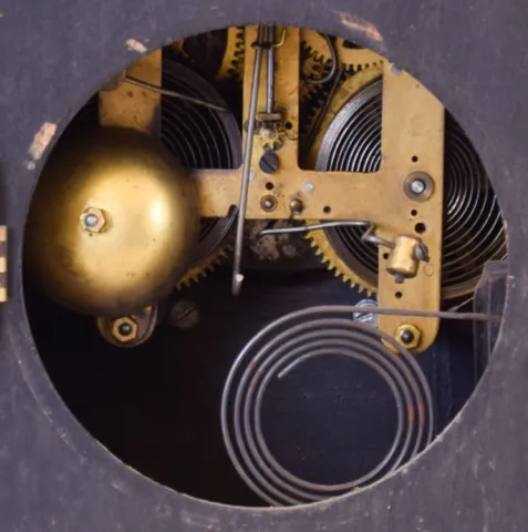 (1) Oak case has lost most of its original finish. Paper dial has been replaced. Both ears on the top crest have been repaired. Original pendulum. Tablet is broken. Hands are not original. Ht 22" (2) Walnut case in original finish. Original painted dial has lost most of its paint. Hour hand is a replacement. Original pendulum and tablet. Ht 23" (3) Walnut case in original finish. Dial, pendulum and tablet are missing. A new dial pan is included. Original hands. Alarm movement is missing. Ht 24" (4) Oak case in original finish. Original porcelain dial has a hairline crack between 8 and 9 o'clock. Original hands. Ht 15" (5) Refinished mahogany and mahogany veneered case. Original Ivorine dial has age darkened a little. Original hands. Ht 13" (6) Walnut case in original finish has a shrinkage crack just below 7 o'clock. Original painted dial in nice condition. Original hands. Pendulum bob is missing. (7) Mahogany veneered case in original finish Original ivorine dial has age darkened a little. Original hands. Ht 13"