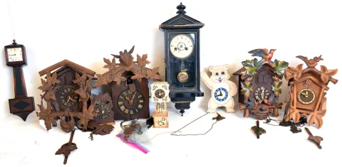 Clocks- 8 (Eight) German / Black Forest and novelty wall clocks: four cuckoos, a miniature Vienna spring driven, a miniature New Haven banjo, a miniature cuckoo and grandfather clock and a moving eye novelty wall clock