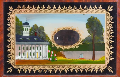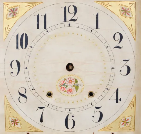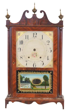 Mahogany and mahogany veneered case in an old finish has original scrolls and feet with some loss to tips on the front skirt. The center strip on the door has been poorly repaired. Movement was made by Seth Thomas. Tablet is an old replacement having an aperture for the pendulum that is not centered. Wood painted dial is period and typical of Seth Thomas with heavy gilt corners. It also has scattered areas of paint loss, has been enlarged in the center and has a heavy worn area on the backside. Missing hands. Finials are modern copies of Seth Thomas type. The side piece behind the right column has had a repair.