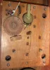 Seth Thomas Clock Co., Plymouth Hollow, Conn., 30 hour, time and strike weight wood movement pillar & scroll shelf clock. Mahogany and mahogany veneered case in an old finish has original scrolls and feet with some loss to tips on the front skirt. The center strip on the door has been poorly repaired. Movement was made by Seth Thomas. Tablet is an old replacement having an aperture for the pendulum that is not centered. Wood painted dial is period and typical of Seth Thomas with heavy gilt corners. It also has scattered areas of paint loss, has been enlarged in the center and has a heavy worn area on the backside. Missing hands. Finials are modern copies of Seth Thomas type. The side piece behind the right column has had a repair.