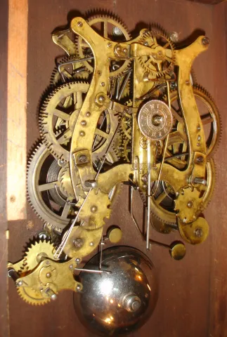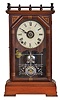 Clocks- 2 (Two) (1) Seth Thomas Clock Co., Thomaston, Conn., "Omaha" shelf clock with an 8 day spring driven time, strike and alarm lyre movement in a cherry case, c1885. (2) Seth Thomas Clock Co., Thomaston, Conn. "Cordova" shelf clock with a 15 day