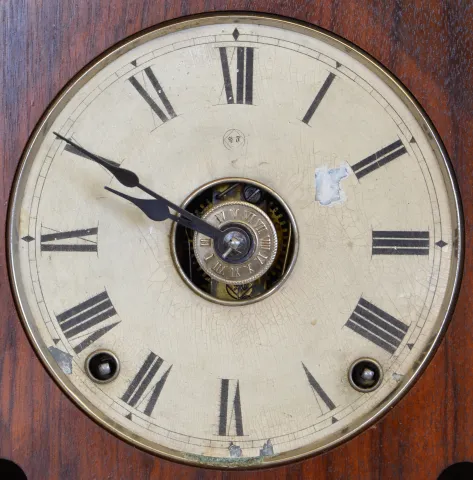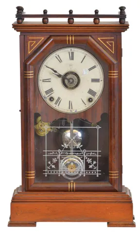 Clocks- 2 (Two) (1) Seth Thomas Clock Co., Thomaston, Conn., "Omaha" shelf clock with an 8 day spring driven time, strike and alarm lyre movement in a cherry case, c1885. (2) Seth Thomas Clock Co., Thomaston, Conn. "Cordova" shelf clock with a 15 day spring driven time & strike movement in a mahogany case, c1900. (1) The case has a nice original finish and is in very good condition with the exception of some damage to the top rail and the right rear post of the top rail. The painted dial is original with some loss at 2, 6 and 8. The hands are correct style, but may be later. The movement is signed. The original stenciled door glass is in very good condition. The pendulum bob is nickel plated with the STCC logo. Overall, a very attractive example of this model. Ht. 19.5in. (2) The case has its original finish and is in excellent condition. The cream porcelain dial is in excellent condition and the hands are original. The movement is signed. Ht. 11in.