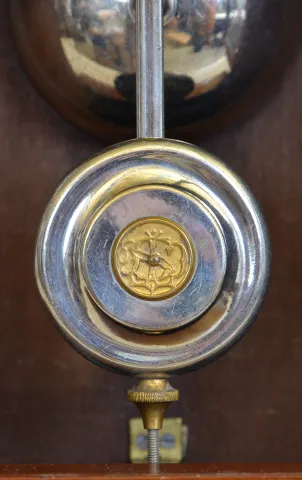 (1) The case has a nice original finish and is in very good condition with the exception of some damage to the top rail and the right rear post of the top rail. The painted dial is original with some loss at 2, 6 and 8. The hands are correct style, but may be later. The movement is signed. The original stenciled door glass is in very good condition. The pendulum bob is nickel plated with the STCC logo. Overall, a very attractive example of this model. Ht. 19.5in. (2) The case has its original finish and is in excellent condition. The cream porcelain dial is in excellent condition and the hands are original. The movement is signed. Ht. 11in.