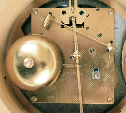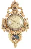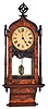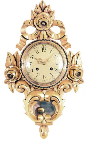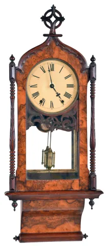 Clocks- 3 (Three) 8 day time and strike wall clocks: Swedish Westerstrand gilt wood cartel; French Morbier ebonized wood bakery clock with iron frame movement, painted metal dial with applied cartouche numbers, mother- of- pearl inlay; Anglo American with burl walnut veneer. all three are in very nice condition but were not tested and are sold as is with no further details available. The Anglo American has a broken top finial and detached sidearm, and its painted metal dial has been poorly touched up at the center; it's case measures 37 in high. Swedish is 21 in; the French, with some cracks at the sides of its front door, is 24.5 in