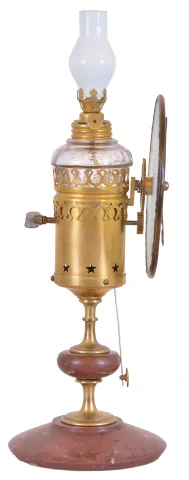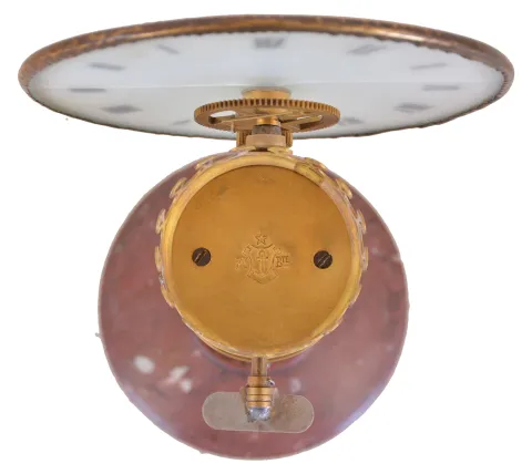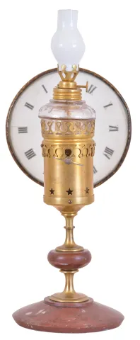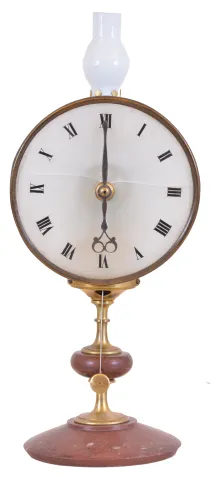France or Germany, night clock, the timepiece with red marble base and turned brass stand, Roman numeral frosted glass dial, 30 hour movement with one hand, and a small lamp, which illuminates the dial