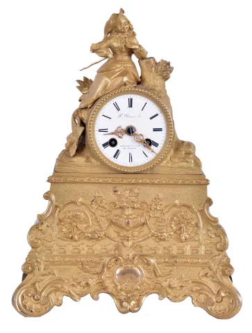 French, 8 day, time and strike spring brass movement with silk thread suspension ormolu figural mantel clock. Dial is marked with a retailer's name: "W. Bremmer, Yorstadt St Pauly Bei Hamburg".