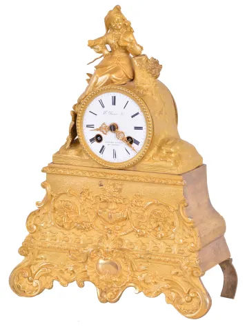 French, 8 day, time and strike spring brass movement with silk thread suspension ormolu figural mantel clock. Dial is marked with a retailer's name: "W. Bremmer, Yorstadt St Pauly Bei Hamburg". Fire gilded case in very fine condition. Original porcelain dial has hairline cracks. Original hands and pendulum.