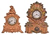 Clocks- 2 (Two): (1) Bristol Brass and Clock Co., New York, 8 day, time and strike spring brass movement cast spelter front shelf clock. Case No. 54 "Eagle" model, by Nicholas Muller, c1860 (2) Waterbury Clock Co., Waterbury, Conn., 8 day, time and strike spring brass movement cast spelter front shelf clock. Case No. 69 "Beggar" model by Nicolas Muller, c1872 (1) Cast front case looks to have its original paint with some minor chips on the base. Paper dial has been replaced. Original hands. Clean label inside the case. Ht 18.5" (2) Cast front case in a bronze finish. Paper dial looks original with some surface wear and abrasion. Hands not original. Clean label inside the case. Ht17"