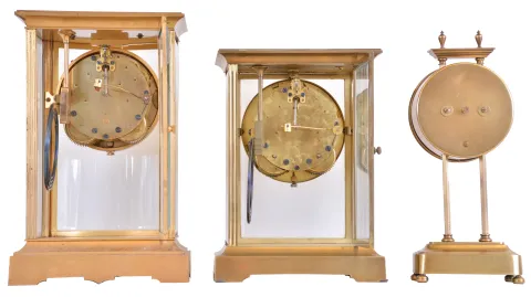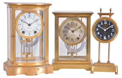 (1) Nicely polished brass case that has some minor dings on the back of the case. Original reverse painted time dial has a little wear at the outer edge near 1 o'clock. Original hands. The clock will need to be serviced as the pendulum is a little sluggish. Ht 10.5" (2) Cast brass case in need of polishing as there are some tarnished areas. Original porcelain dial is perfect and original hands. There is a tiny chip on the rear door beveled glass panel. The rest of the panels are fine. Ht 11" (3) Polished brass case in clean condition. Original silvered dial is tarnished and has some fine scratches. Original hands and pendulum. All the beveled glass panels are fine. H 9.5"