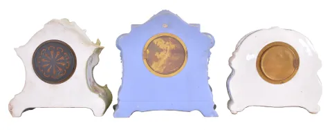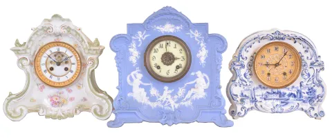 Clocks- 3 (Three): (1) French, Marti & Cie, 8 day, time and strike spring brass movement porcelain mantel clock, c1900 (2) New Haven Clock Co., New Haven, Conn., 8 day, time and strike spring brass movement porcelain mantel clock, c1900 (3) Waterbury Clock Co., Waterbury, Conn., 8 day, time and strike spring brass movement porcelain mantel clock, c1900 (1) Cream and green porcelain case in nice condition with some wear to the applied gold. Original porcelain dial is perfect and original hands. Visible escapement movement. Ht 11" (2) A very nice blue and white Jasperware (Wedgewood style) case. Original porcelain dial is perfect. Original hands. Nice label inside the rear door. Ht 11.75" (3) Porcelain case in a Dutch or Delft motif in nice condition. Original paper dial with brass grill is very clean for its age. Original hands. Movement is signed. Ht 9.5"