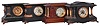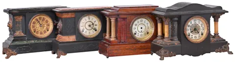 (1) Black and faux marble Adamantine case in nice condition. Original paper dial has age darkened a little, has surface abrasions and some wear. Original hands. Someone has a added a small music box movement inside the case that winds behind the left lion. The music box is tripped by the movement and is operational. Ht 11" (2) Black and faux marble Adamantine case in good condition. Original paper dial has age darkened a little. Original hands. Rear access door is not attached. Ht 12" (3) Green marble and black Adamantine case has some small damage at the lower left corner and loss of the gilding in the incised lines. Original paper and dial has age darkened. Original hands. Door glass is missing. Pendulum is missing. Ht 11" (4) Adamantine case has some loss on the base and the back edges. The front pillars are missing and one of the button feet is missing. There is no movement, hands or pendulum. Ht 11"