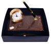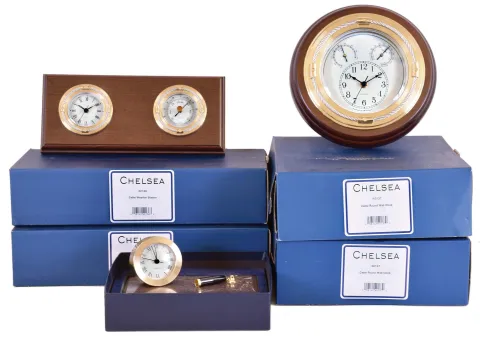 Clocks- 5 (Five) Chelsea Clock Company quartz movement clocks and desk sets, new / old stock in factory gift boxes: two #40- 137 "Cable Round Wall Clock"; desk set with pen on marble base; two #40136 "Cable Weather Station" with barometer on wood stand all are in their original labeled gift packaging and are new and unused. None have batteries or were tested, so sold as is. Overall diameter of round wall clock is 9.5 in