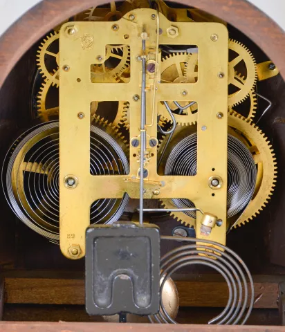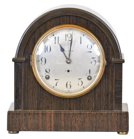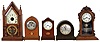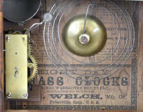 Clocks- 5 (Five): (1) German shelf clock with a spring driven 8 day time and strike movement in a walnut case with inlay, c1910. (2) Unmarked shelf clock with a spring driven 30 hour time and strike movement in a walnut case, c1900. (3) E. N. Welch Mfg.