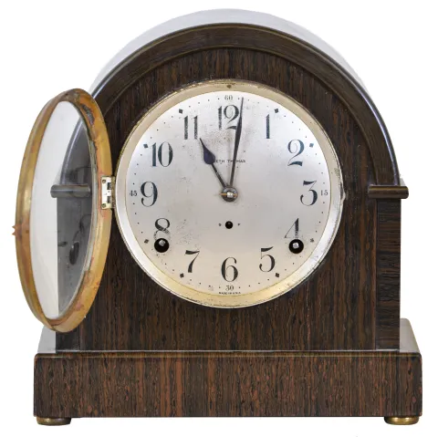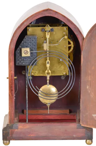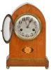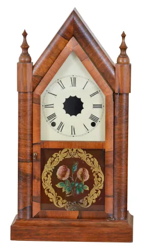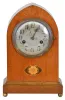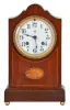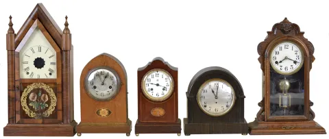 (1) The case is nicely finished. The silver dial shows some wear. The hands appear original. Ht 11,.75in. (2) The case has been refinished The paper dial is in very good condition, The hands may be replaced. The movement is not signed. The door glass may be a replaced. Ht. 17in. (3) The rosewood veneered case has been nicely refinished. The original dial has been repainted. The alarm mechanism is intact, Ht. 19in. (4) The case retains its original finish with several small areas of veneer loss. The porcelain dial has several hairline cracks and slight chipping at the strike winding hole. The hands are original. The movement is signed. The beveled glass for the dial is in nice condition. (5) The case is in nice condition with original finish. The silvered dial shows some wear. The hands are original. The movement is signed. Ht, 9.5in.