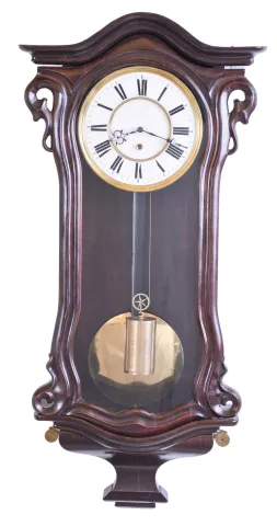 Germany, unsigned Vienna regulator style wall clock, 8 day, time only, weight driven movement in a serpentine style ebonized case with white enamel two part dial. the case has been refinished. The dial has some light hairlines.