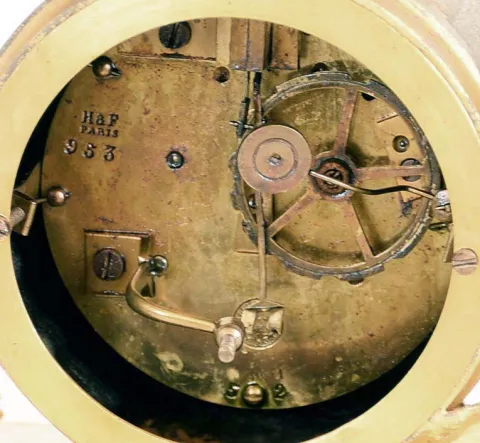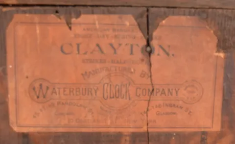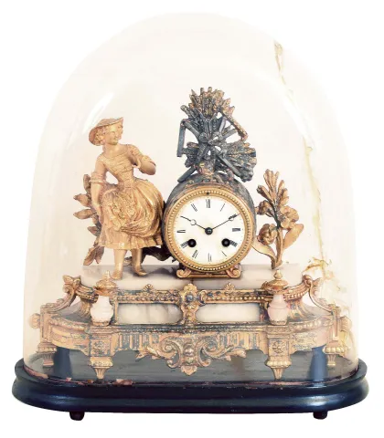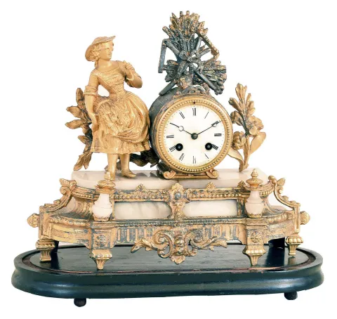 Clocks- 4 (Four) time and strike mantel and shelf clocks: Seth Thomas "Metals No.5" oak 8 day kitchen clock, c. 1905; Waterbury "Clayton" oak 8 day kitchen clock, c. 1900; Gilbert Mfg. Co. 30 hour mahogany veneer OG, c. 1870; French gilt- spelter and white alabaster marble figural 8 day mantel clock on ebonized wood base under glass dome, Marti "Medaille D'Honneur" bell- strike movement, c. 1900. the two kitchen clocks are in very good original condition including rear paper labels. The OG also is very good, with its inside paper factory label. The French figural has worn gilding and a cracked dome, but no damage to the ornate cast metal case. All appear complete but none were tested and are sold as is