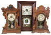 Clocks- 4 (Four) time and strike mantel and shelf clocks: Seth Thomas "Metals No.5" oak 8 day kitchen clock, c. 1905; Waterbury "Clayton" oak 8 day kitchen clock, c. 1900; Gilbert Mfg. Co. 30 hour mahogany veneer OG, c. 1870; French gilt- spelter and