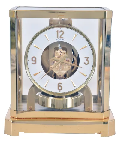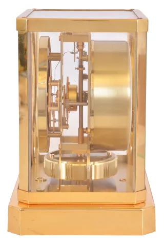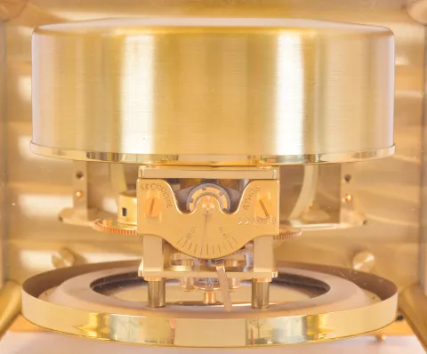 LeCoultre & Cie, Switzerland, "Atmos" clock, 15 jewel gilt caliber 528 movement, gilt torsion pendulum, round white painted dial with applied gilt Arabic numerals and arrow markers, gilt hands, contained in a glazed rectangular case with removable front