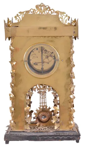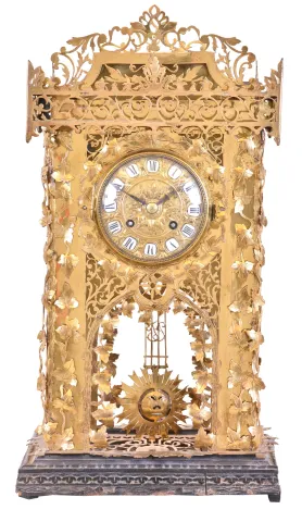 Mantel or table clock, the brass case with elaborate piercing, and applied brass leaves and vines, mounted to a similarly carved wooden base, the overall design seemingly inspired by the carving on Black Forest cuckoo clocks, cast dial with repousse style ornament, and white enamel, Roman numeral cartouches, blued steel hands, and 8 day time and strike pendule de Paris movement, signed Dumoulinneuf Paris case with minor breaks and losses, wooden base incomplete, dial with losses to gilding, movement ticks and strikes, pendulum with added weight