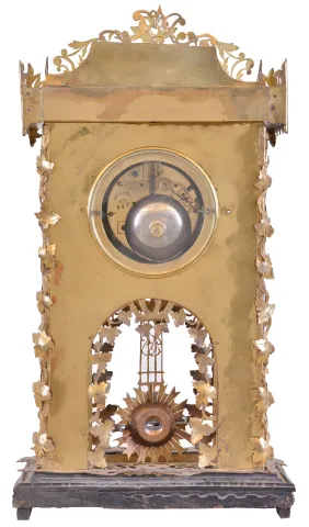 Mantel or table clock, the brass case with elaborate piercing, and applied brass leaves and vines, mounted to a similarly carved wooden base, the overall design seemingly inspired by the carving on Black Forest cuckoo clocks, cast dial with repousse style